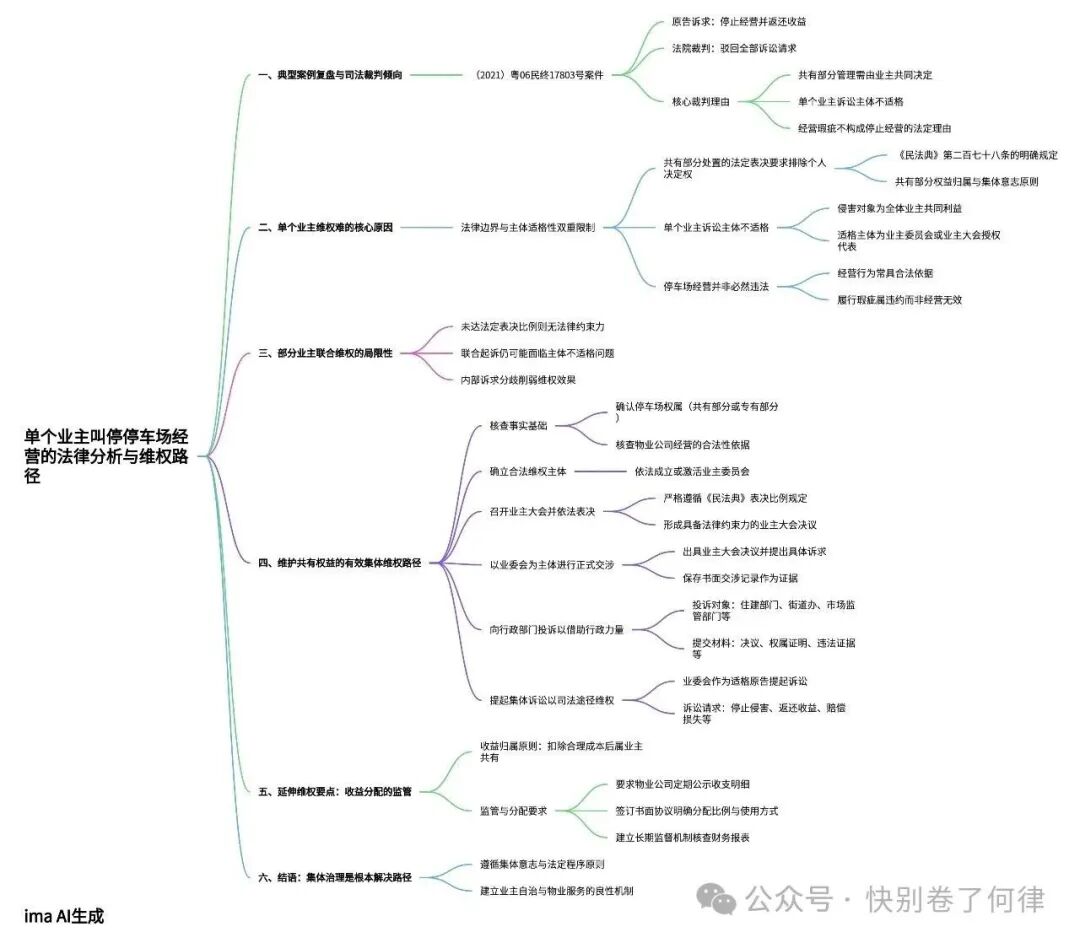 (2021)粤06民终17803号案件中,某小区单个业主作为原告,主张物业公司未取得全体业主同意,擅自利用小区公共道路、空地设置停车场并对外经营,停车费未公示、未分配,侵害业主共有权益,诉请法院判令物业公司立即停止停车场经营管理,并返还违规收取的停车收益。庭审中,物业公司辩称,案涉停车场的规划与运营已在前期物业管理协议中约定,运营期间办理了相关停车管理备案手续,停车费收取标准符合当地物价部门规定,且部分停车收益已用于小区公共设施维护修缮,并非擅自经营。法院经审理驳回原告全部诉讼请求,核心裁判理由为:案涉停车场所占公共区域属全体业主共有,对共有部分的使用、经营和管理,是涉及全体业主共同利益的重大事项,依据《民法典》及《物业管理条例》,此类事项应由业主共同决定,单个业主无权以个人名义主张停止物业公司的经营管理行为。同时,物业公司的停车场经营并非无合法依据,虽在收益公示与分配上存在瑕疵,但该瑕疵不足以成为单个业主要求停止经营的法定理由,原告可通过业主大会、业主委员会等集体途径主张合法权益。 该判决并非个例,全国范围内类似物权纠纷中,法院裁判思路高度一致:单个业主无法代表全体业主意志,其单独提出的停止共有部分经营的诉求,因缺乏法律依据、诉讼主体不适格,难以获得司法支持,这一结果背后,是清晰的法律规定与小区集体治理的基本原则。